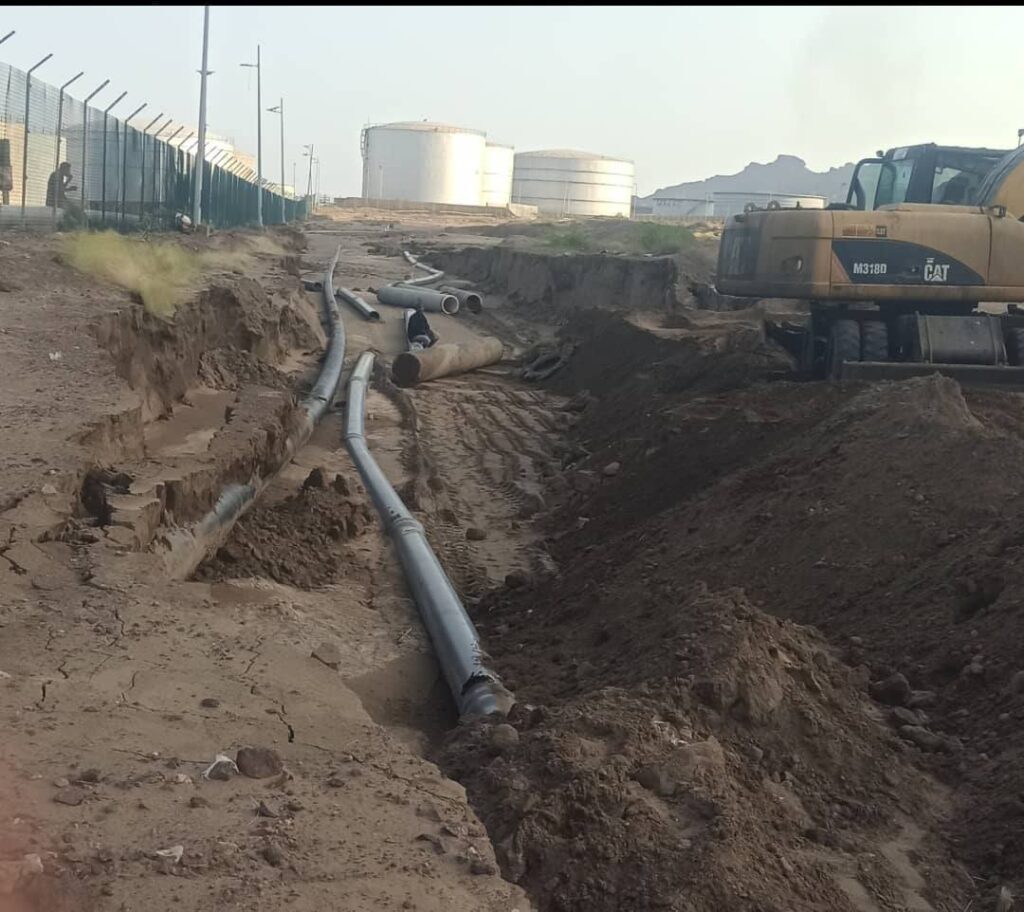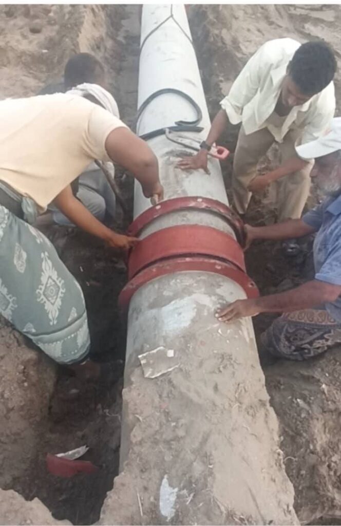باشرت فرق الصيانة التابعة للمؤسسة المحلية للمياه والصرف الصحي بعدن، اليوم، أعمال إصلاح كسر في خط الضخ الرئيسي للمياه بقطر (20) سبيستو، والذي يغذي خزانات مديرية البريقة.